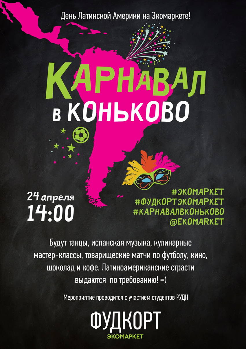 ДЕНЬ ЛАТИНСКОЙ АМЕРИКИ НА ЭКОМАРКЕТЕ 24 апреля Москва, ул. Профсоюзная 126, корпус 3 Апрель — это пробуждение, предвкушение теплых дней лета. Впереди — время ярких природных красок, пора цветения и самых ярких вечеринок. 24 апреля 14.00 до 20.00 рынок фермерских продуктов Экомаркет в Коньково приглашает всех окунуться в атмосферу жаркого летнего дня Латинской Америки. При поддержке студенческого сообщества университета РУДН рынок превратиться в солнечный Рио! В этот день гости Экомаркета и жители района смогут познакомиться с далекими культурами, узнать больше о жителях других государств, завести полезные дружеские связи. Приходите и ощутите на себе настоящие латиноамериканские страсти – на одной площадке и в один день: танцы, еда, напитки и карнавал! Событие обещает быть грандиозным, а лекции, мастер-классы и дегустации сделают день незабываемым. Программа мероприятий: