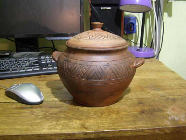 ![]() Мне просто невдомёк - за что такие деньги?! Около года назад заказывала у глиняных дел мастера из украинской глубинки горшок литра на 2,5, чтобы делать плов и жаркое на всю семью. Форму и размер сделал, какую я попросила. Также я просила не покрывать глянцем и не украшать красками, поэтому без глазури внутри и снаружи. Так что 100% натур продукт, даже обожжён просто в молоке, без добавления чего-либо. Обошёлся он мне с доставкой около 120грн., не помню какой тогда был курс, но даже если до взлёта курса, то не больше 15 долларов, по нынешнему - долларов 5 .Это фото мастера, лень самой фотографировать: ![]() Крышечку в прошлом месяце тоже "разбил паралич" Накрываю листом фольги - нормуль...Кстати блюда в нём получаются очень вкусными. Я давно и часто готовлю гарниры и мясо в глиняном горшке - ещё со свадьбы есть горшочек вместительностью литра на полтора. Вкус приготовленного в кастрюле очень отличается, при чём не в лучшую сторону.